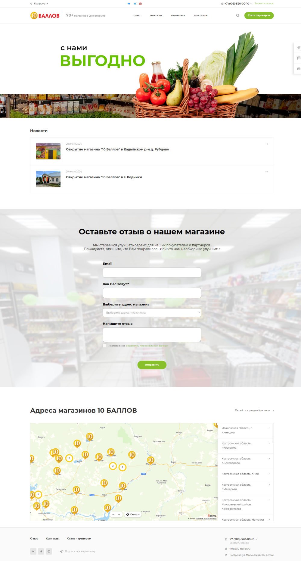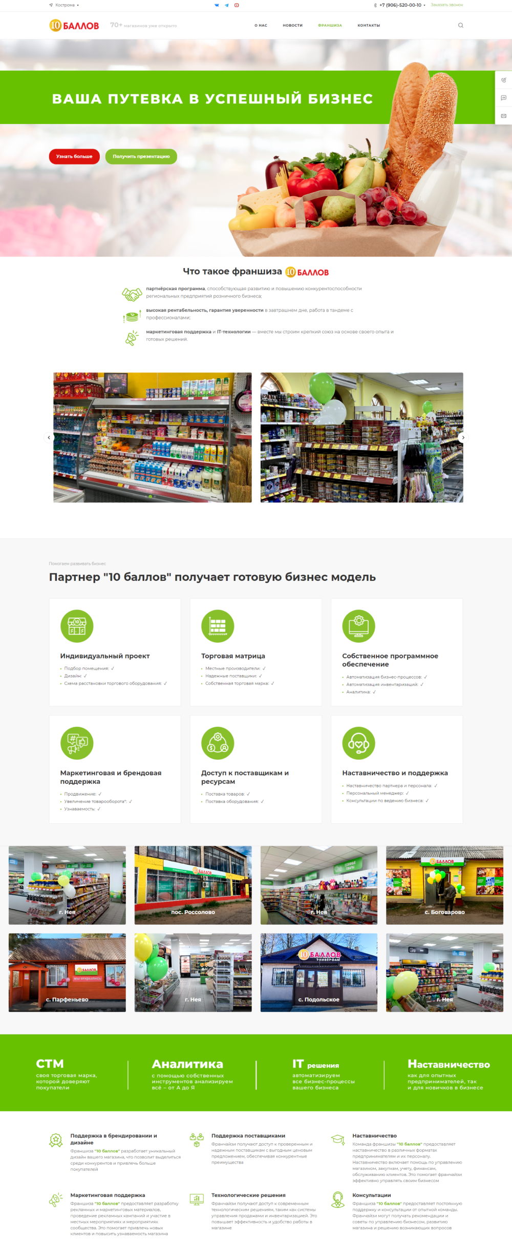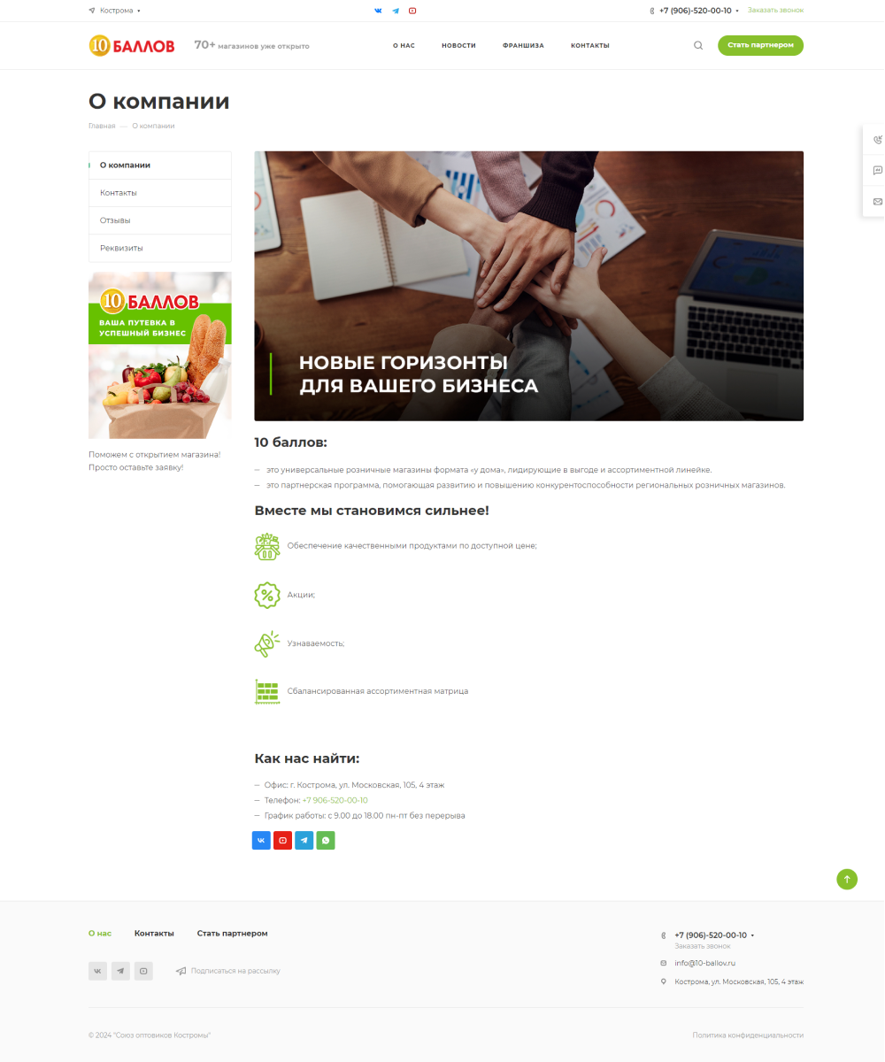 Нами был создан интересный проект для магазинов 10 баллов, который стал мощным инструментом для привлечения и информирования потенциальных партнеров. Самым важным было подробно и наглядно рассказать о том, что из себя представляет франшиза. Ведь партнерская программа 10 баллов полностью сопровождает франчайзи в пути становления. Нашей задачей было максимально прозрачно показать какие варианты сотрудничества существуют, а также продемонстрировать уже реализованные проекты на карте Костромской и Ярославской областей. Для заинтересованных пользователей мы реализовали несколько способов связи с нами: заказ звонка, форма обратной связи для бесплатной консультации, подача заявки на франшизу, запрос на получение подробной презентации, онлайн чат и кликабельный номер телефона для удобства использования с мобильного устройства. А также на сайте можно ознакомиться с реальными отзывами и фотографиями действующих магазинов открытых по франшизе 10 баллов.