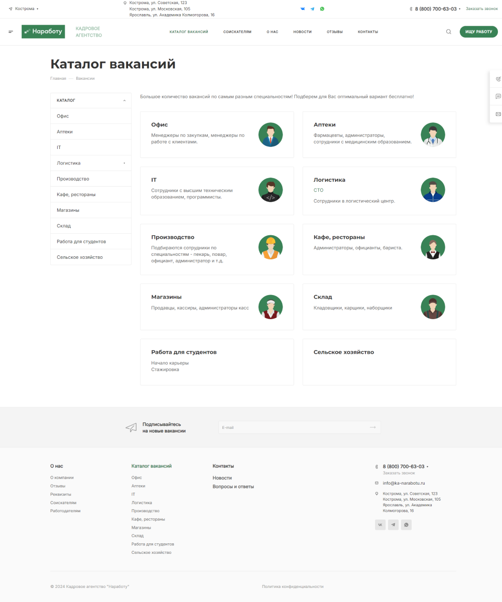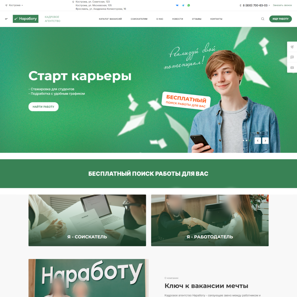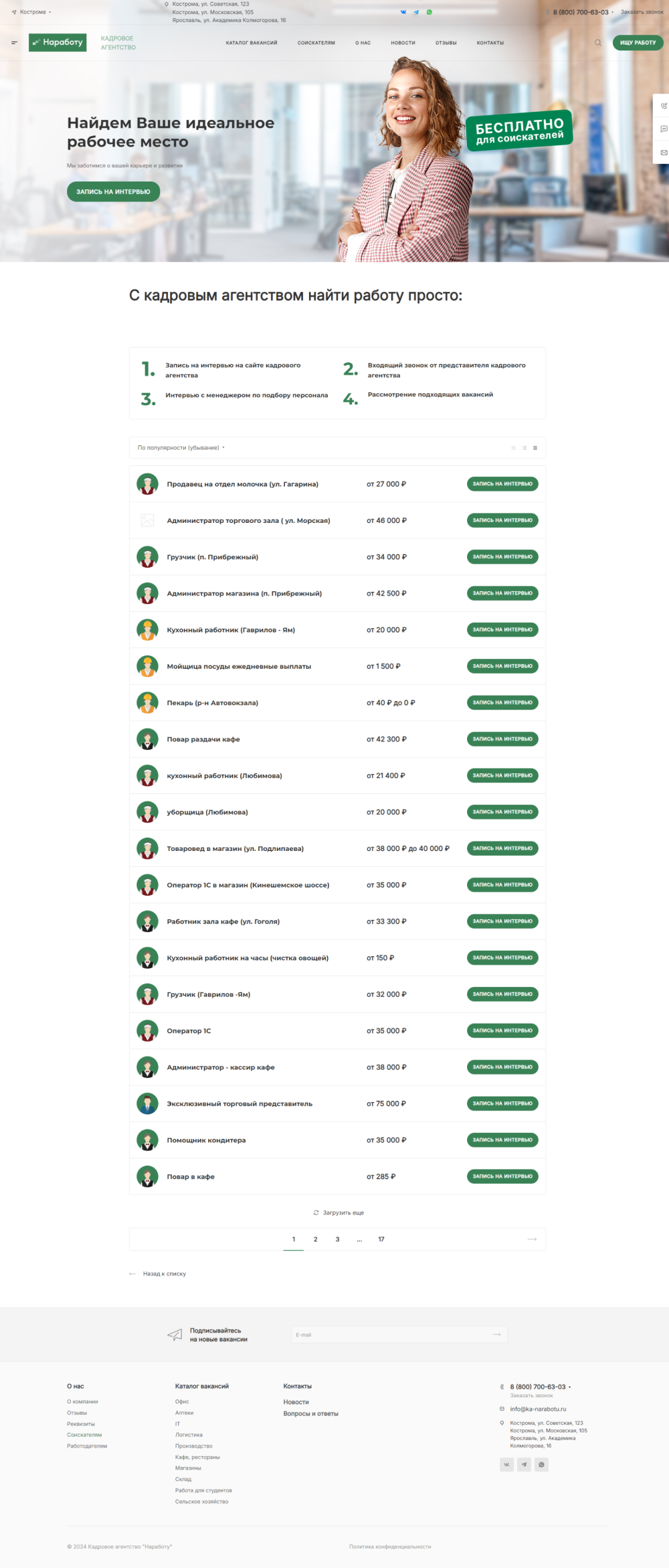 Для каждого посетителя сайта есть удобные инструменты: для работодателей форма заявки, после отправки, которой сотрудники агентства свяжутся по предоставленным контактам. А для соискателей представлен обширный и удобный каталог вакансий. Где они могут быстро найти подходящие предложения благодаря гибкой системе фильтров по отраслям, местоположению и другим ключевым параметрам. Каталог обновляется в режиме реального времени, обеспечивая актуальность предложений.
